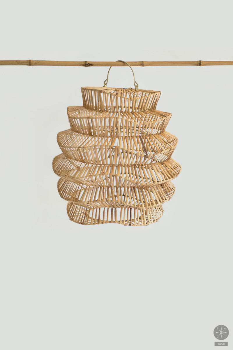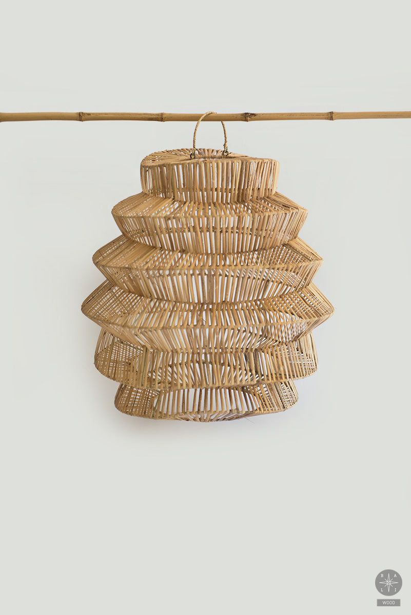 Rankų darbo šviestuvo gaubtas iš rotango iš Balio – natūralus, lengvas ir šiltą atmosferą kuriantis interjero akcentas.